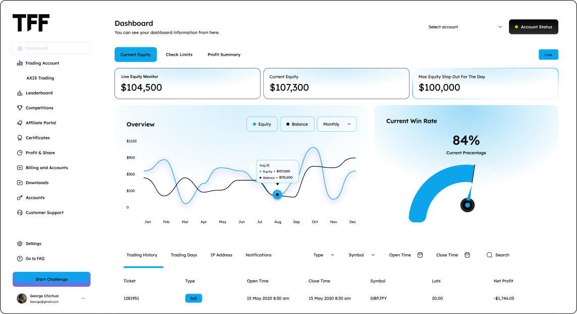 TFF provides cutting-edge tools to support your trading journey, including automated journaling to analyze and improve performance, and a dedicated trader support team to guide you every step of the way.